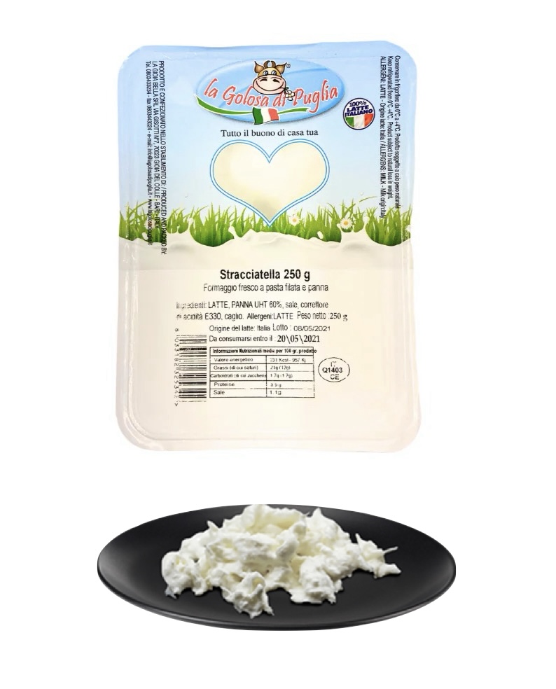 La stracciatella è un formaggio fresco della tradizione Pugliese nato in origine dai residui della lavorazione della mozzarella, nel corso del tempo è diventata un'autentica specialità gastronomica grazie al suo sapore delicato ed alla cremosità. Stracciatella fiordilatte pugliese - Caseificio Voglia di Latte viene spedita esclusivamente ogni lunedì e mercoledì, prodotta la sera precedente dal caseificio Pugliese voglia di latte per garantirne la massima freschezza. È naturalmente ottima se mangiata al naturale o con degli affettati, ma è anche un alleato eclettico in cucina per le tue ricette. Ad esempio in uno spaghetto Pasta Bossolasco con sugo di Pomodori Ciliegino di Pachino ed un aggiunta di 'Nduja di Suino Nero - Consorzio Nero di Calabria al fine di creare contrasto con la dolcezza della stracciatella, infine Olive verdi Siciliane Nocellara del Belice schiacciate condite - Az. Agricola Melia# denocciolate come guarnizione.
