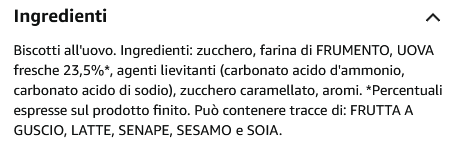 Zucchero 49,2%, farina di frumento, uova fresche 23,5%, agenti lievitanti (carbonato acido d'ammonio, carbonato acido di sodio), zucchero caramellato, aromi.