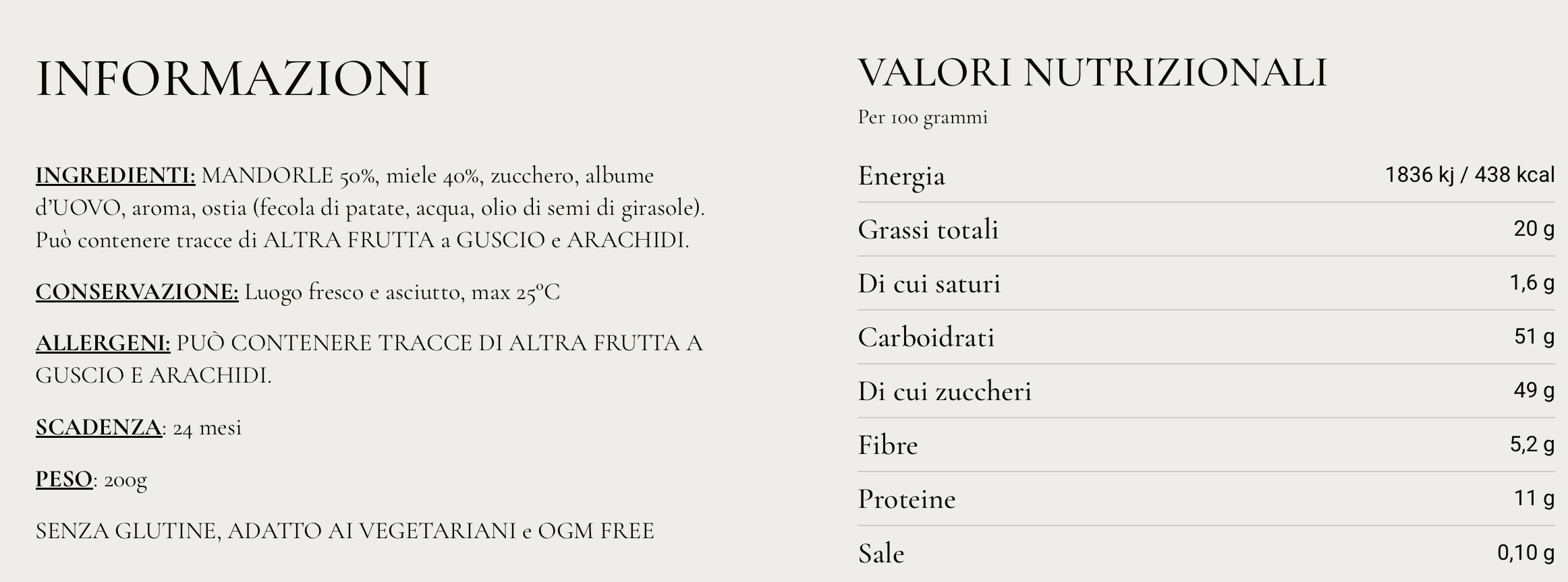 Torrone artigianale friabile da 200g, stirato a mano con il 50 % di mandorle e il 40 % di miele.