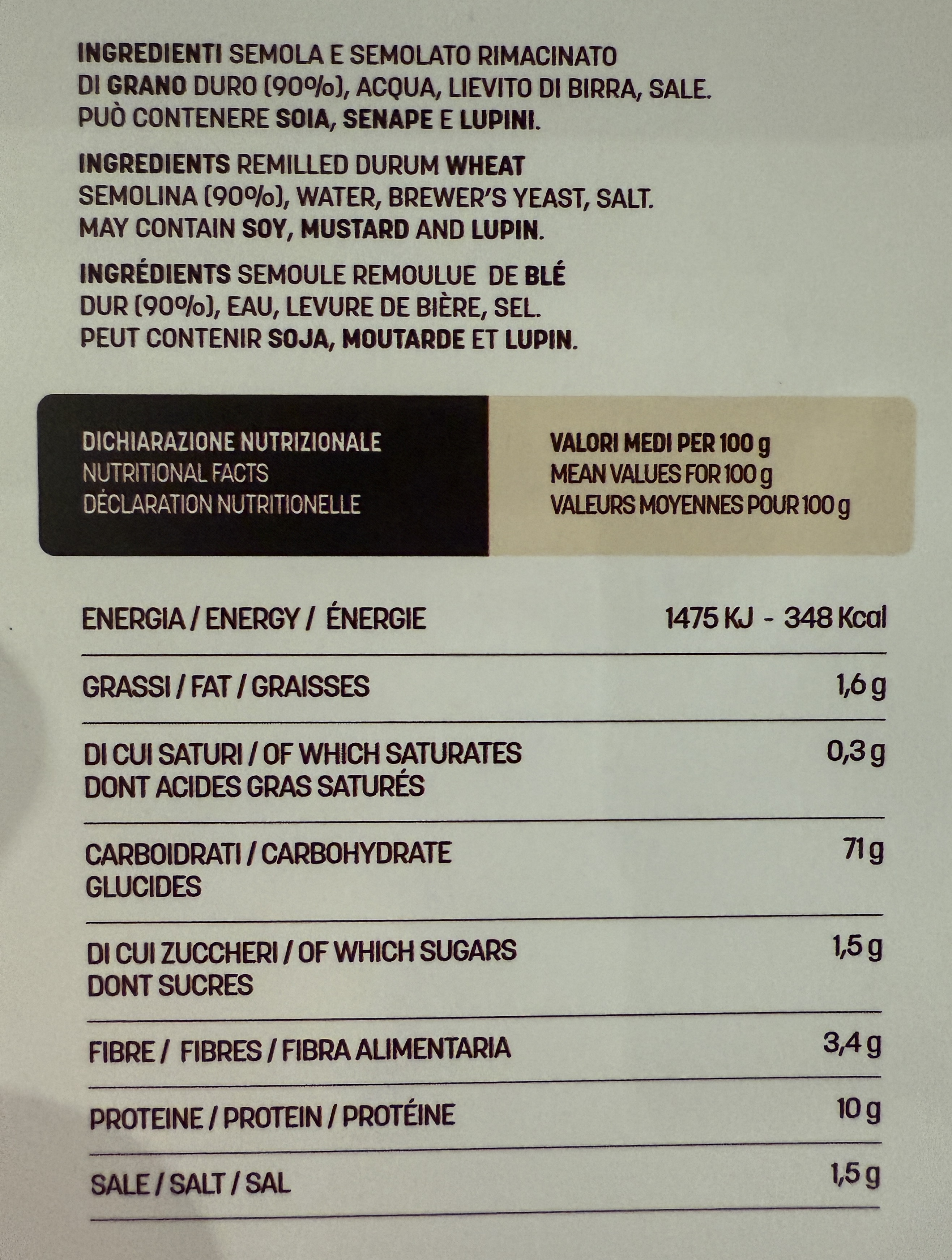 Semola rimacinata di grano duro, acqua, lievito di birra, sale