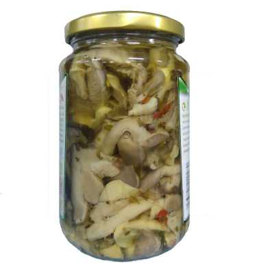 Ingredienti: Funghi 65% in proporzione variabile (Pleurotus Ostreatus, Lentinus Edodes, Funghi Strophana Rugosa), olio di semi di girasole, peperoni, aceto, semi di finocchio, aglio. Acidificante: Acido Citrico Antiossidante: Acido Ascorbico
