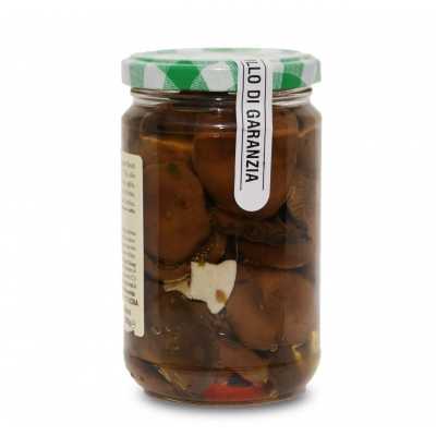 Ingredienti: Funghi (Lactarius Deliciosus), olio di semi di girasole, peperoni, sale, aceto, aglio, semi di finocchio. Acidificante: Acido Citrico, Antiossidante: Acido Ascorbico