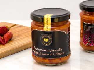 Una vera prelibatezza, peperoncini calabresi ripieni alla 'Nduja di suino nero. Ottimi come aperitivo, da gustare su pane, bruschette o su carni lesse.