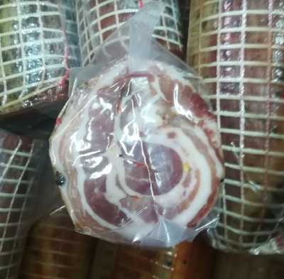 Fatta con carne di maiale allevati in Italia, peperoncino piccante calabrese e sale. Una lenta stagionatura naturale che porta il prodotto finito alla sua consistenza classica. La pancetta arrotolata viene utilizzata sia come antipasto che in cucina.