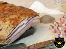 Pancetta di maiale nero di Calabria, lavorata con sale e pepe rosso dolce.